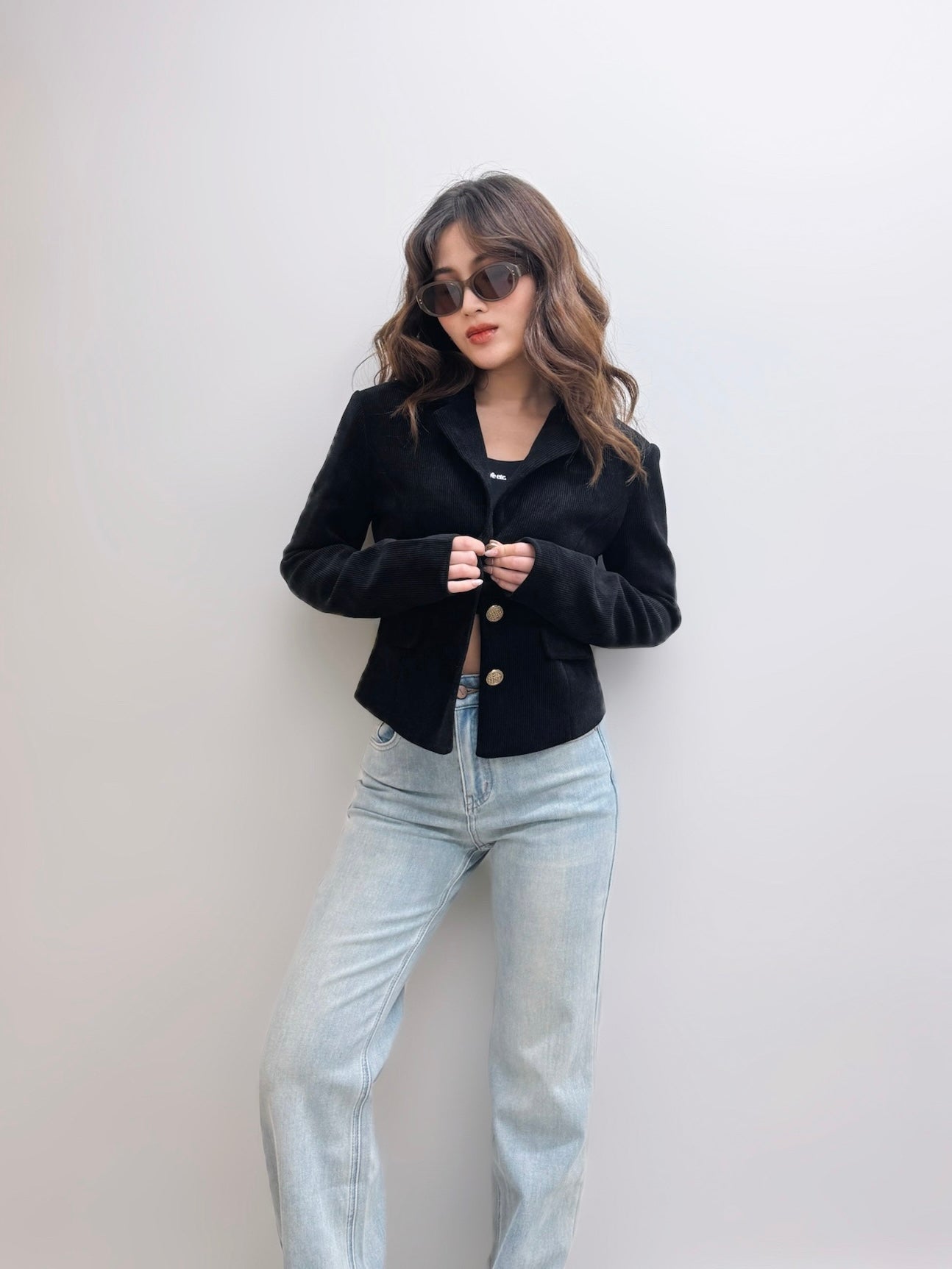 經典反領西裝外套搭配 old money 金扣
